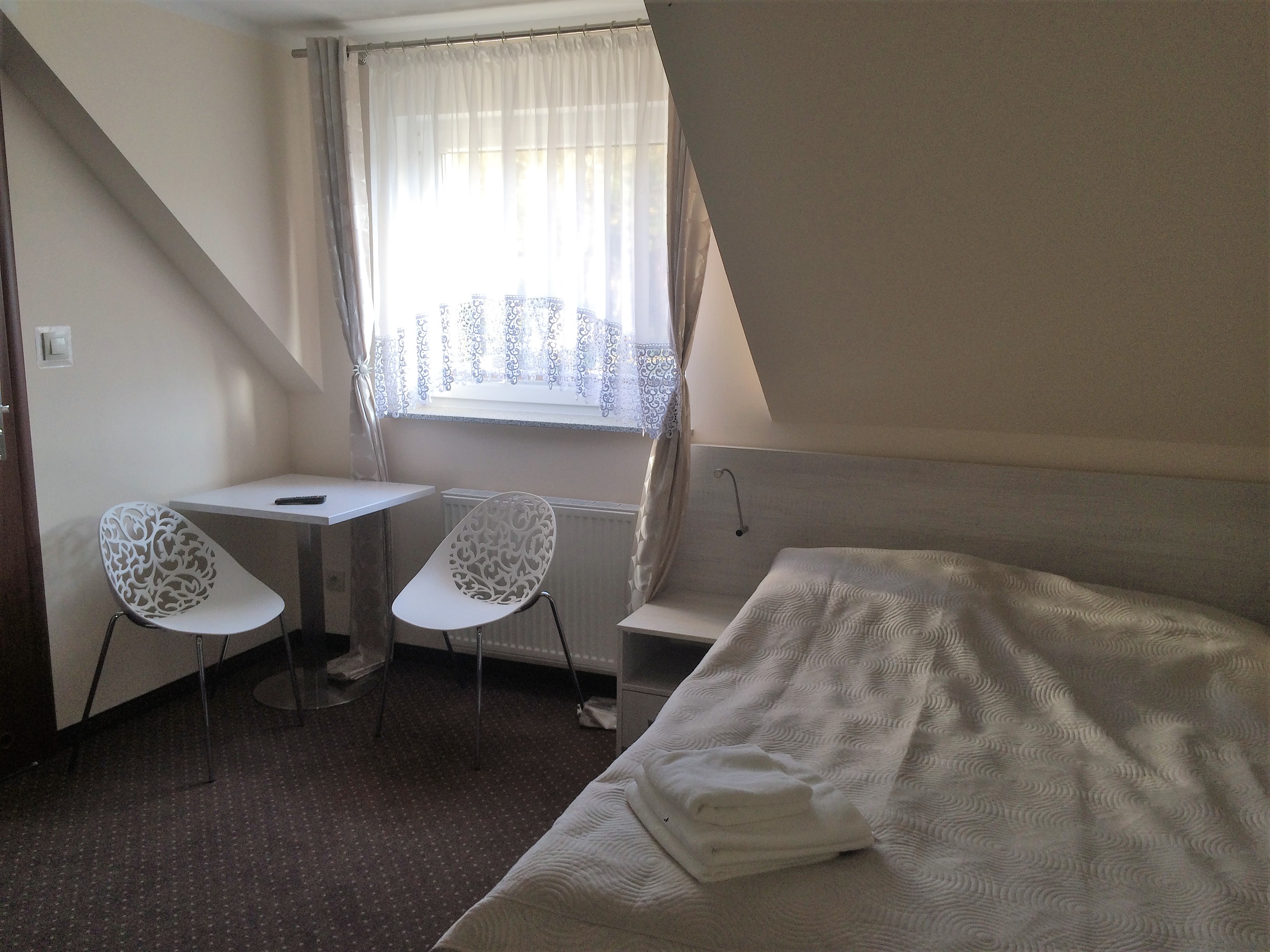 POKÓJ DLA 2 OSÓB Z ŁAZIENKĄ WYPOSAŻONY W LODÓWKĘ HOTELOWĄ, CZAJNIK ELEKTRYCZNY, NACZYNIA, SZTUĆCE ORAZ SZKLANKI