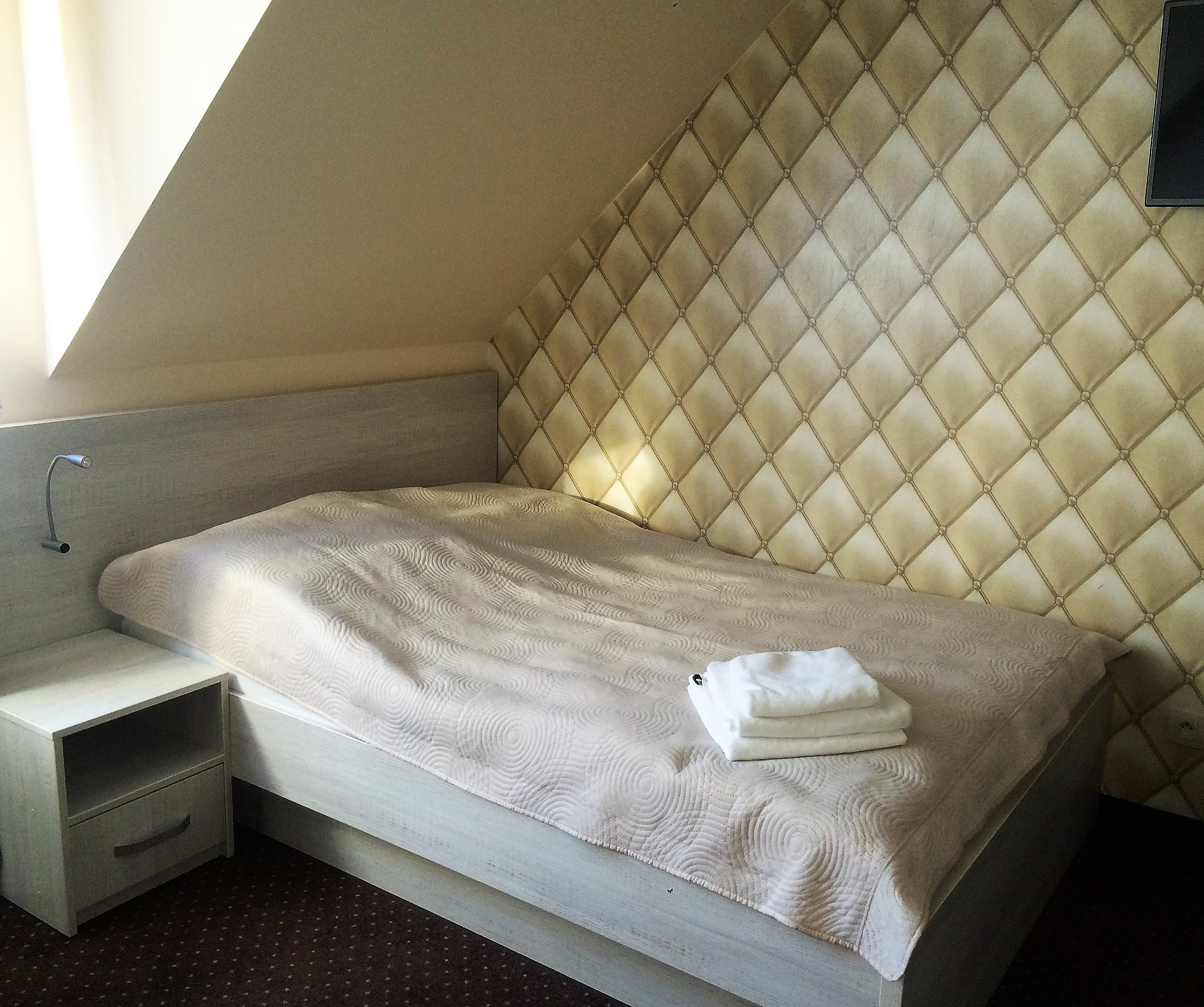 POKÓJ DLA 2 OSÓB Z ŁAZIENKĄ WYPOSAŻONY W LODÓWKĘ HOTELOWĄ, CZAJNIK ELEKTRYCZNY, NACZYNIA, SZTUĆCE ORAZ SZKLANKI