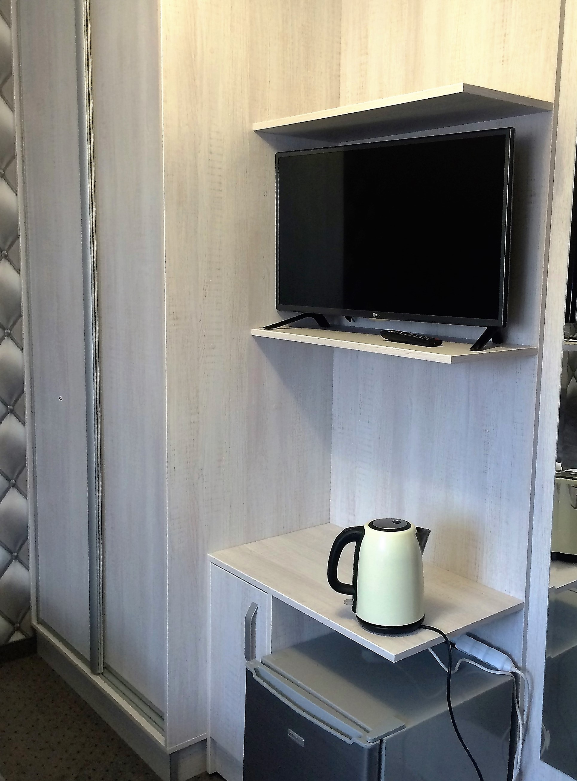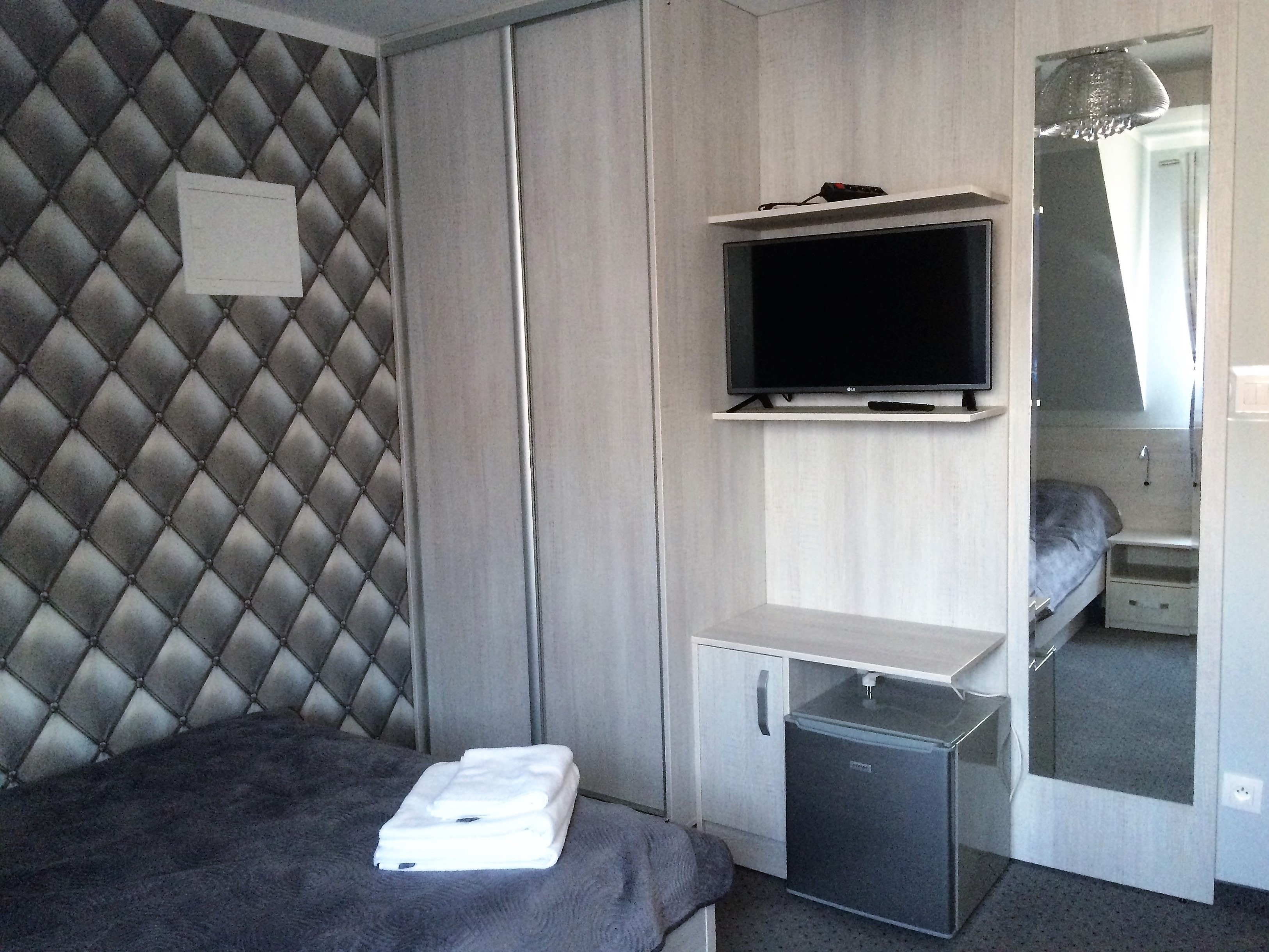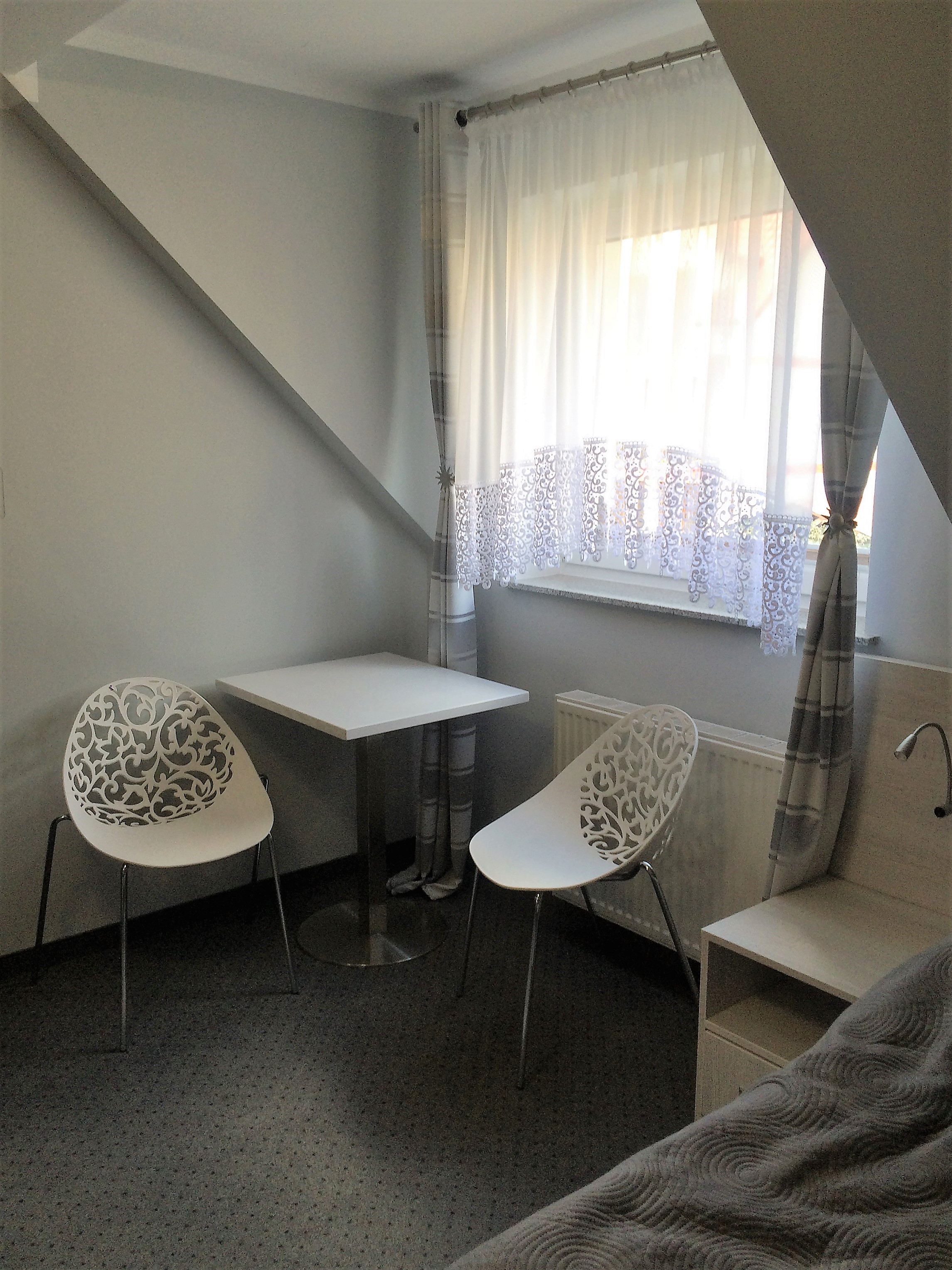 POKÓJ DLA 2 OSÓB Z ŁAZIENKĄ WYPOSAŻONY W LODÓWKĘ HOTELOWĄ, CZAJNIK ELEKTRYCZNY, NACZYNIA, SZTUĆCE ORAZ SZKLANKI